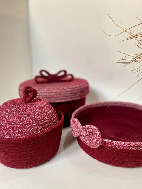 ست سه تیکه سامل باکس گرد درب دار پاپیونی، قندونی، سبد گره دار میباشد. مناسب جهت طبقه بندی وسایل خانه و اتاق خواب استفاده از قیطان درجه یک و دوخت با کیفیت و قابلیت شستشو
